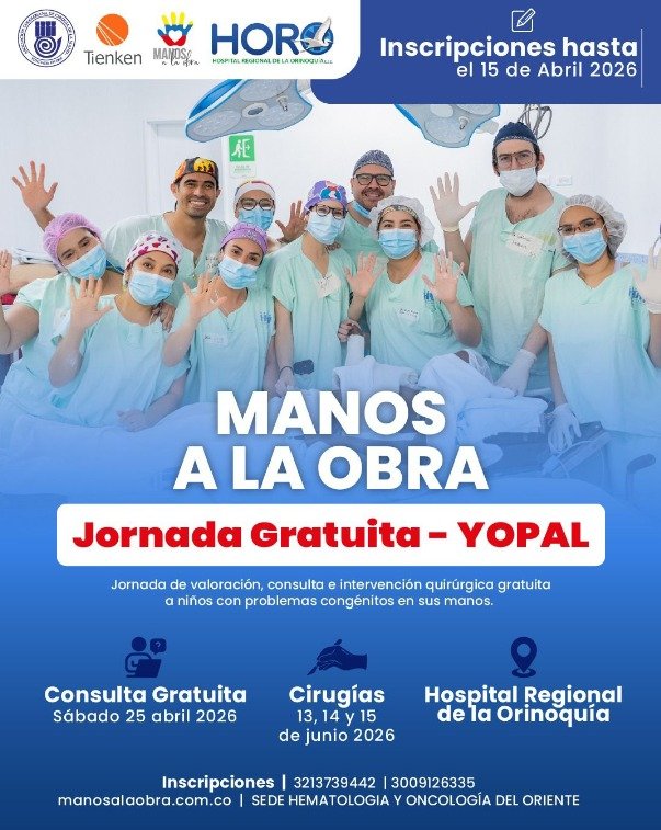El Hospital Regional de la Orinoquía (HORO), junto a la Oficina de Acción Social Departamental y la fundación Manos a la Obra, invita a la comunidad de Casanare a participar en la misión médica que realizará cirugías reconstructivas gratuitas de mano para personas con malformaciones congénitas o alteraciones en las extremidades superiores.