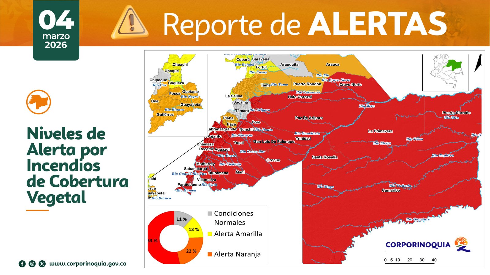 El más reciente reporte del IDEAM señala que el 53% del territorio de la jurisdicción de Corporinoquia se encuentra en alerta roja por incendios de cobertura vegetal, el 22% en alerta naranja y el 13% en alerta amarilla