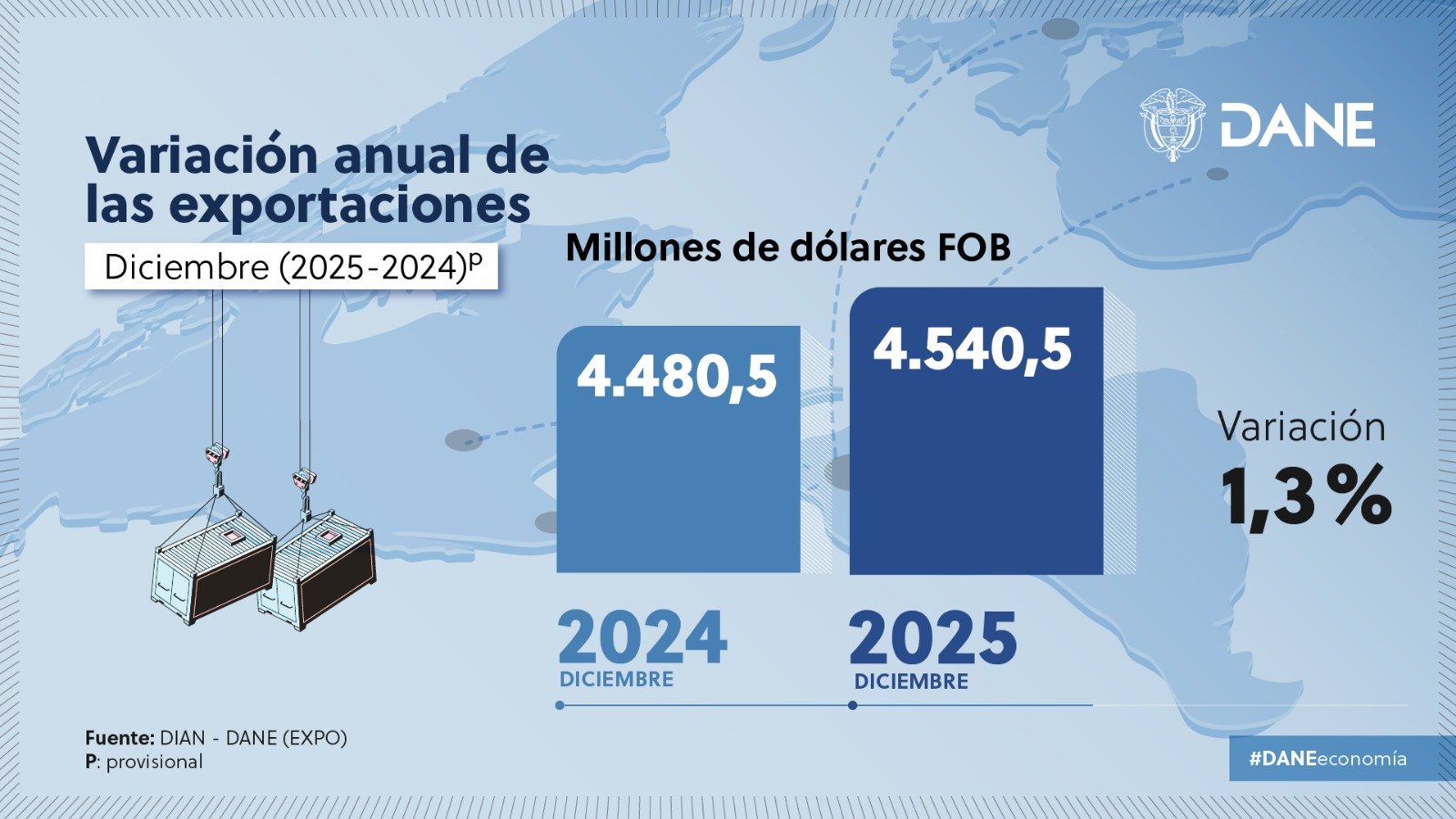 El Departamento Administrativo Nacional de Estadística (DANE) dio a conocer los resultados de las exportaciones correspondientes a diciembre de 2025, procesados en conjunto con la Dirección de Impuestos y Aduanas Nacionales (DIAN).